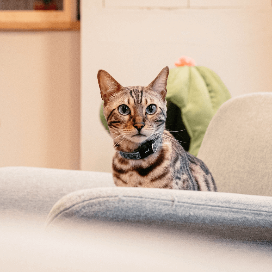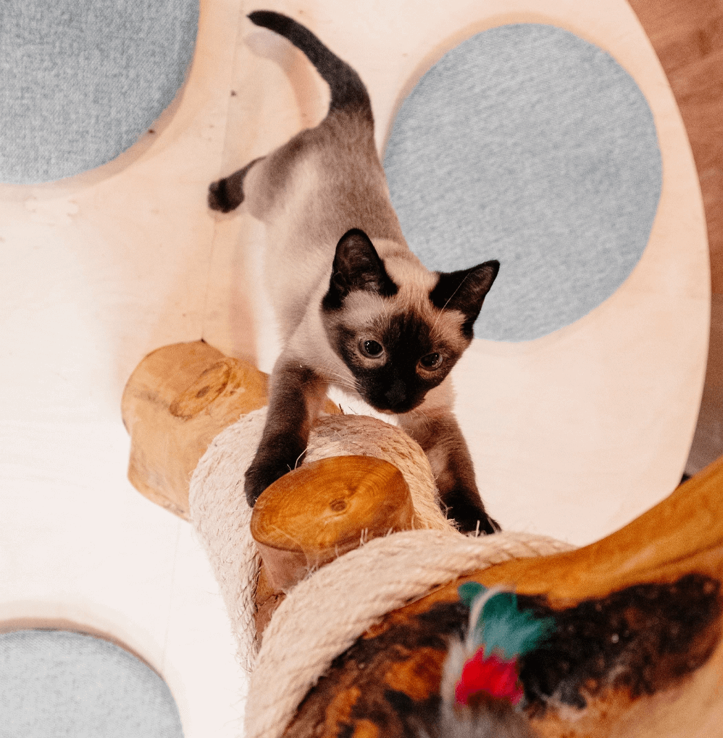 Een echte acrobaat die het liefst de hoogte opzoekt om alles goed in de gaten te houden. Met zijn sierlijke bewegingen en aanhankelijke karakter weet hij iedereen om zijn pootje te winden. Wanneer hij aandacht wil, kan hij luid miauwen om dit duidelijk te maken. Zijn nieuwsgierigheid kent geen grenzen; geen enkele deur is voor hem veilig, want hij móét weten wat zich erachter bevindt. Daarnaast geniet hij ervan om dicht tegen je aan te liggen op de bank. Wat zijn eetgewoonten betreft: hij geeft de voorkeur aan brokjes en laat snoepjes liever links liggen.